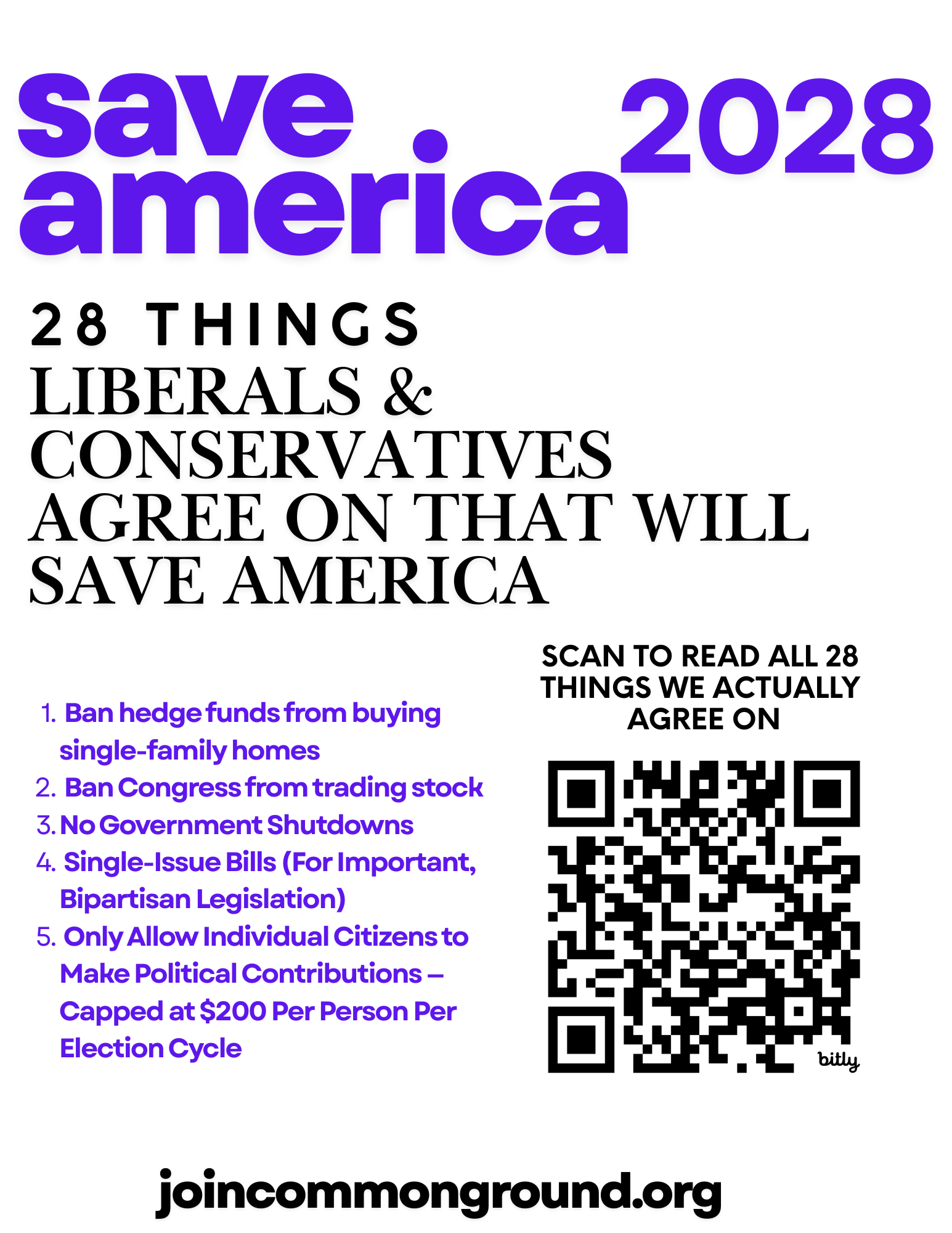 Americans are tired of division, dishonesty, and government that serves special interests instead of the people. Conservatives, liberals, and independents nationwide overwhelmingly agree on a core set of reforms — the Save America 28 — that would strengthen our democracy, lower corruption, and restore trust in our institutions.